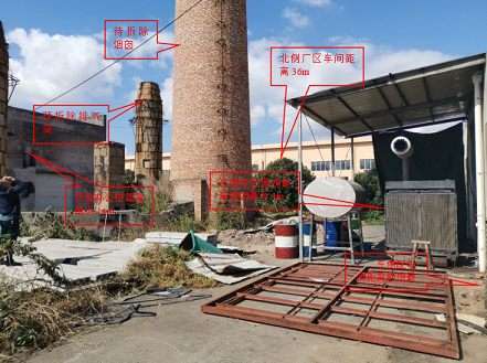 该烟囱高55m,为砖结构烟囱,位于浙江鹏特机械科技有限公司厂区内,爆破周边地理环境复杂:距西北侧厂房车间36m;距离东侧变压器房、配电房仅4m;距西侧办公楼仅14m。业主要求厂区内烟囱周边其他建筑物均需要保护,因此在爆破时需要采取必要的防护措施,确保周边建筑物安全。