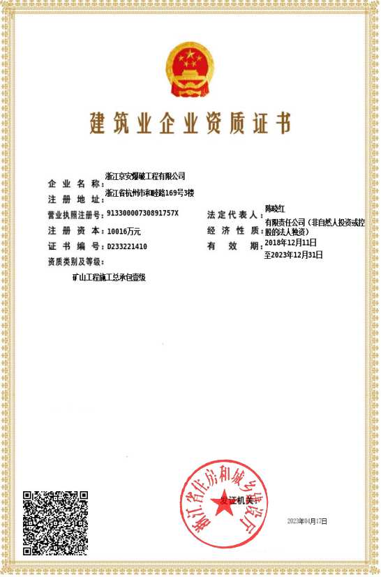 2023矿山工程总承包一级资质证书